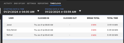On the Timeclock screen, you'll see a list of users on the left side of the screen. On the right side of the screen, you are able to choose dates from which to view recorded shifts.