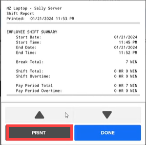 To view an employee shift report, select the date and time parameters for the shift from the top of the screen and select the shift from the resulting list.