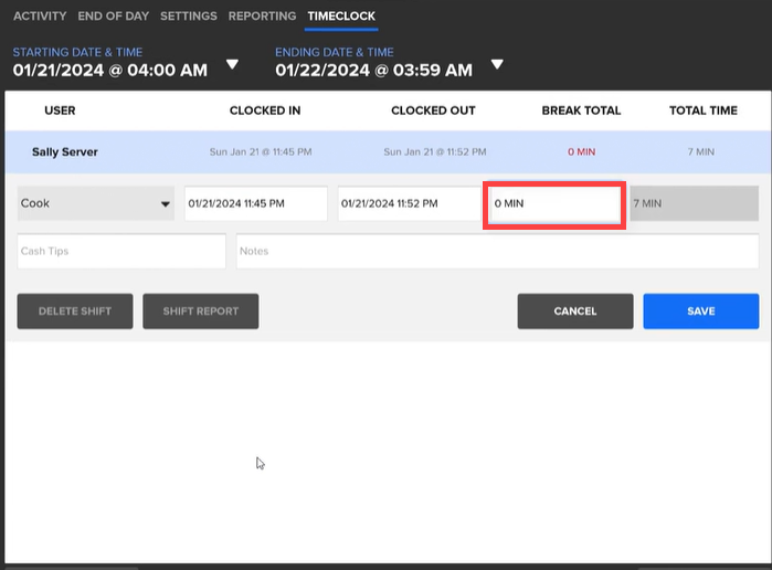You can also select a Clock Out date and time, as well as a Break Total, Cash Tips, and any Notes for the shift. Then select Save.